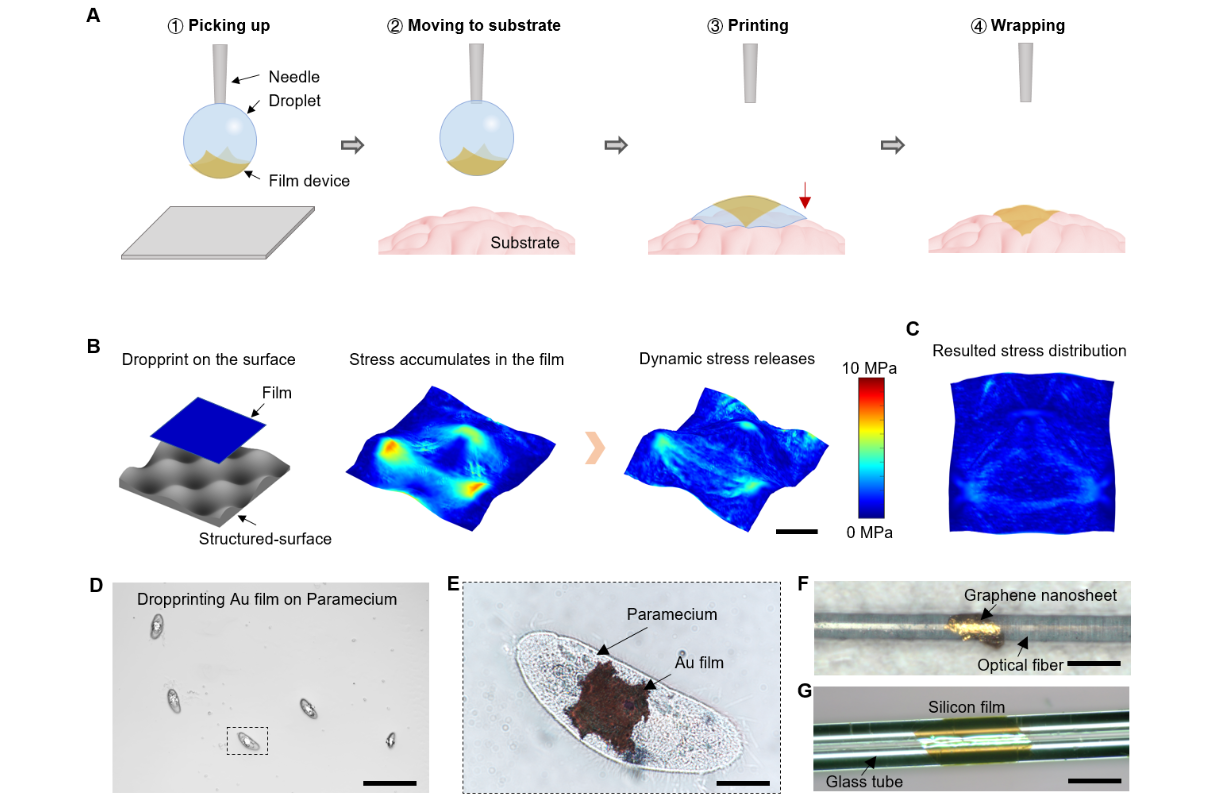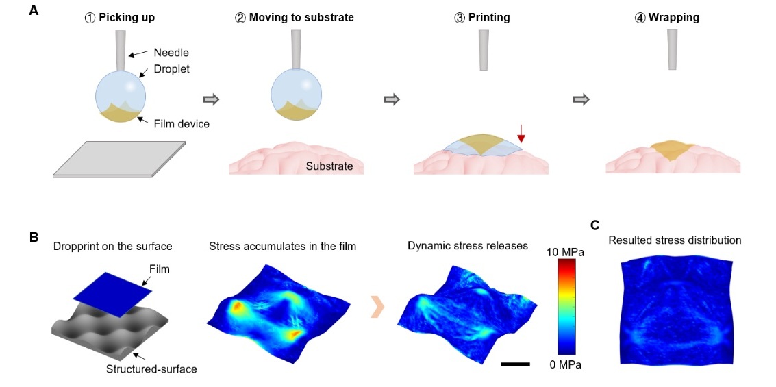 近年来,随着可穿戴电子、脑机接口和神经康复等前沿技术迅速发展,迫切需要将精密电子器件如同“皮肤”一般贴合到器官组织上,实现对生理信号的采集和调控。然而,传统贴附方法往往导致器件内部产生巨大应力,尤其是当贴合在起伏不平的皮肤、大脑或神经表面时,器件内部脆弱的超薄金属线路和芯片很容易因应力集中而损坏,这成为柔性电子发展的一大瓶颈。在国家自然科学基金委员会、科技部、中国...