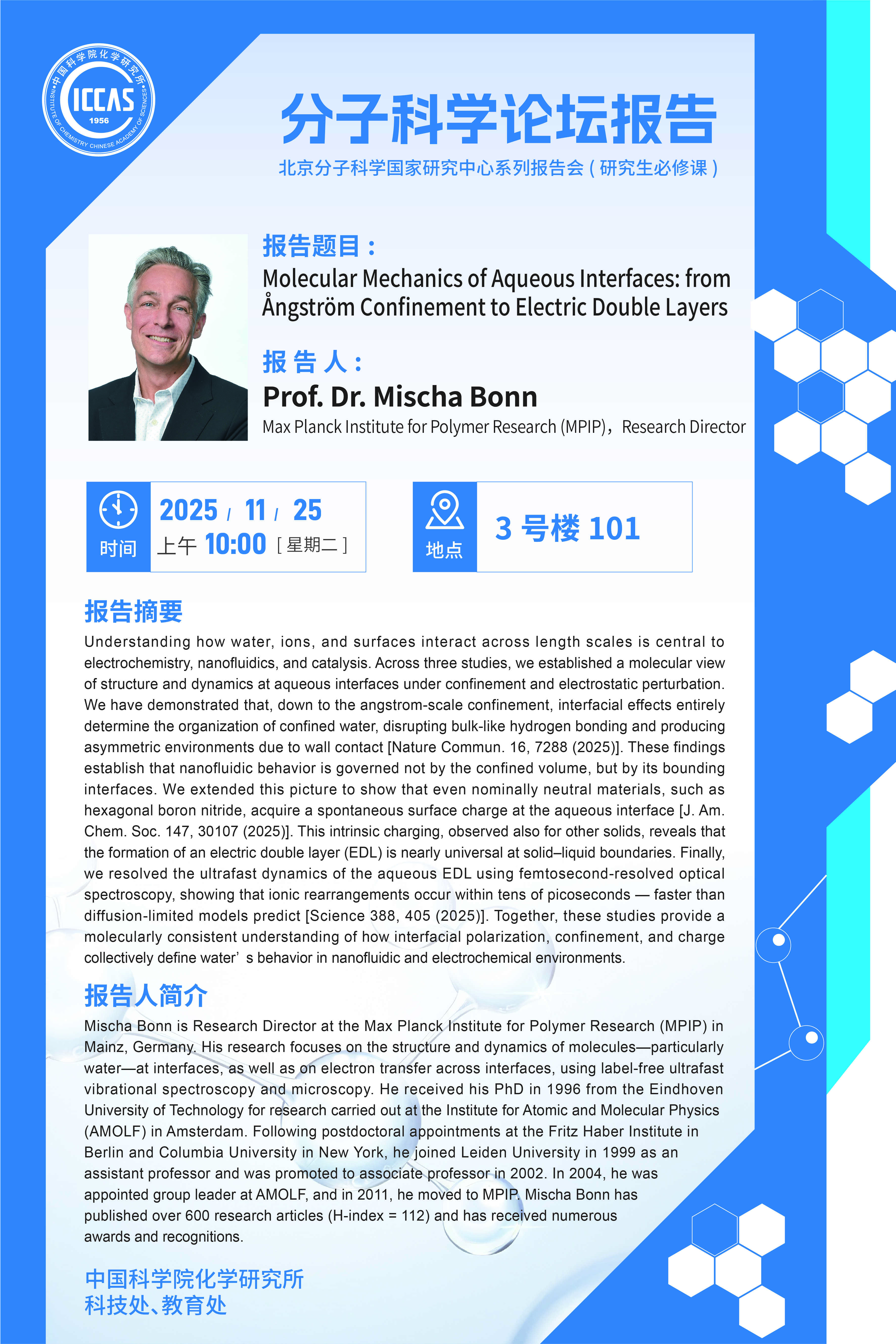 德国马普高分子研究所Mischa Bonn教授拟于2025年11月25日访问化学所并作分子科学论坛报告