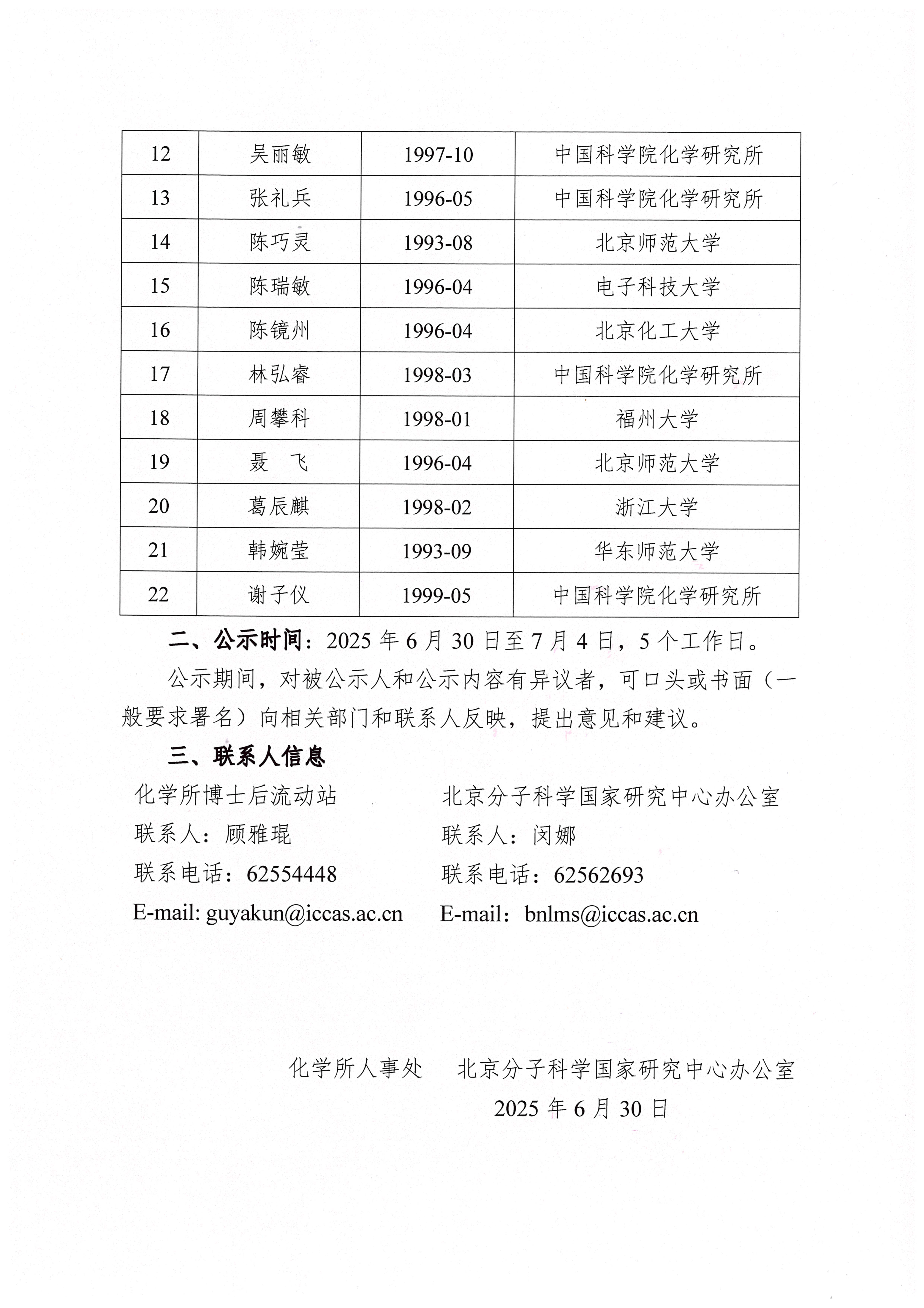 化学所关于对2025年第一批北京分子科学国家研究中心博士后项目拟资助人员进行公示的通知