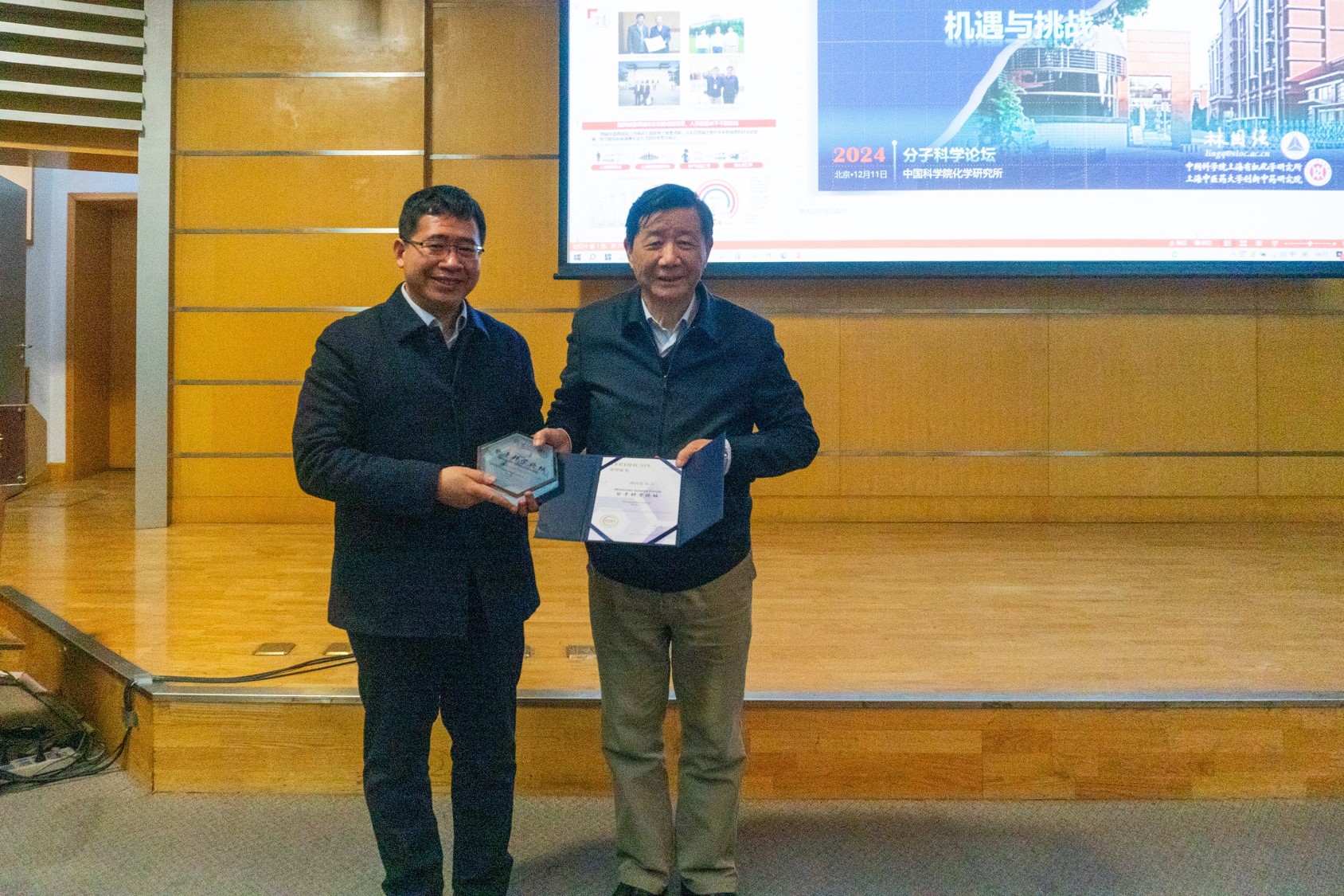 2024年12月11日,中国科学院上海有机化学研究所/上海中医药大学林国强院士访问化学所,并作题为:“中药创新研发:机遇与挑战” 的分子科学论坛报告。党委书记范青华主持报告,王树所长为林国强院士颁发了“分子科学论坛”荣誉证书和奖牌。