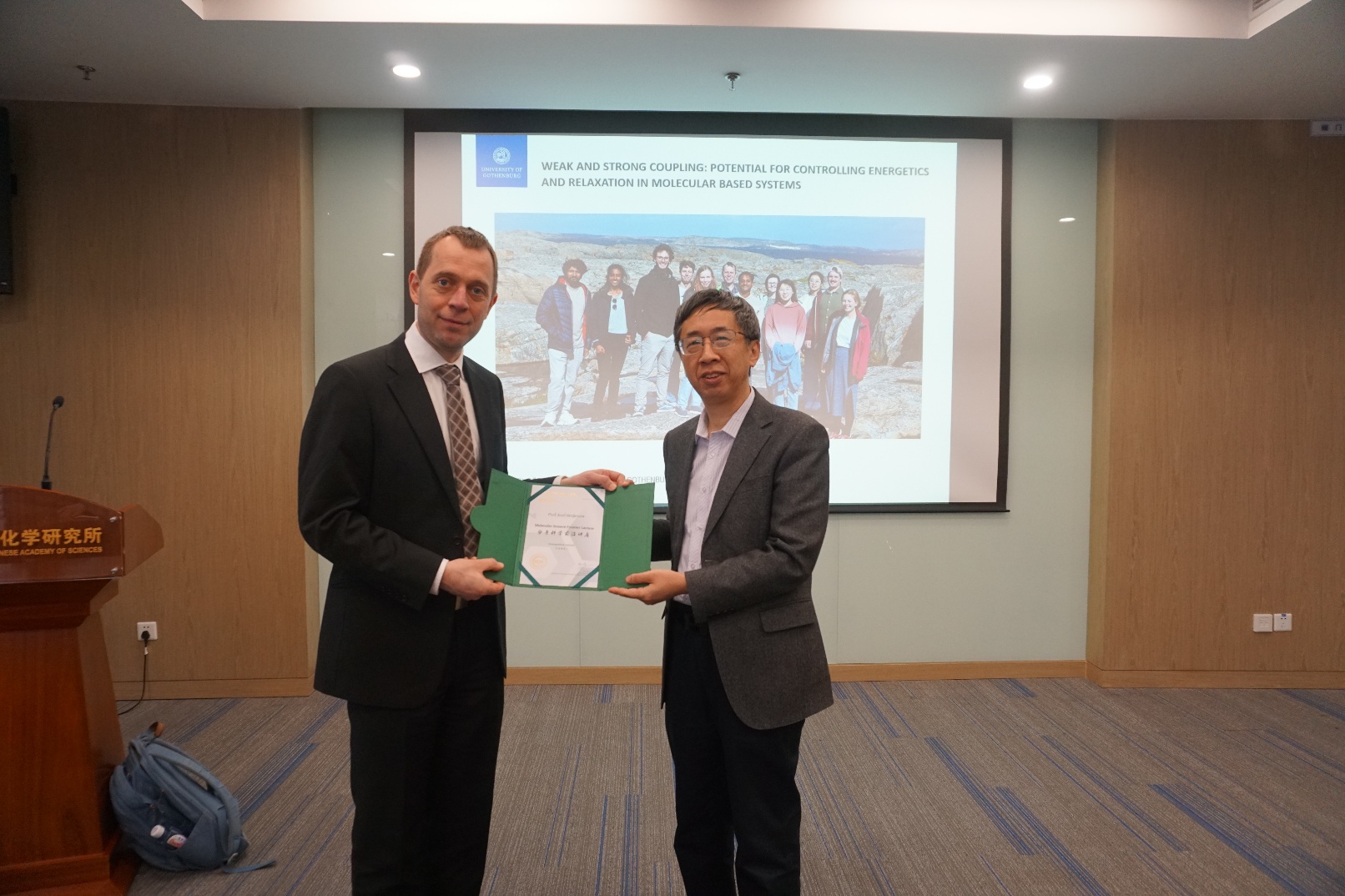 2025年3月25日,瑞典哥德堡大学Karl Börjesson教授访问化学所,并作题为“Weak and strong coupling: potential for controlling energetics and relaxation in molecular based systems”的分子科学前沿讲座。董焕丽研究员主持讲座,郑企雨副所长为Karl Börjesson教授颁发了分子科学前沿讲座荣誉证书。