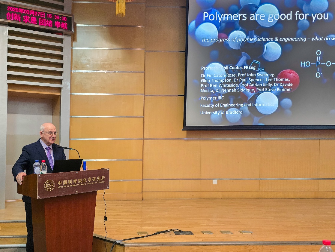 2025年3月27日,英国布拉德福德大学(University of Bradford)Phil Coates教授访问化学所,并作题为"Polymers are good for you – the progress of polymer science and engineering"的分子科学论坛报告。董侠研究员主持报告,王树所长为Phil Coates教授颁发"分子科学论坛"荣誉证书及奖牌。