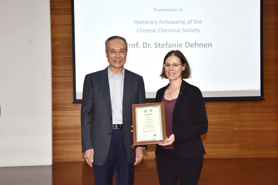 中国化学会理事长万立骏院士为Stefanie Dehnen教授颁发荣誉会士证书