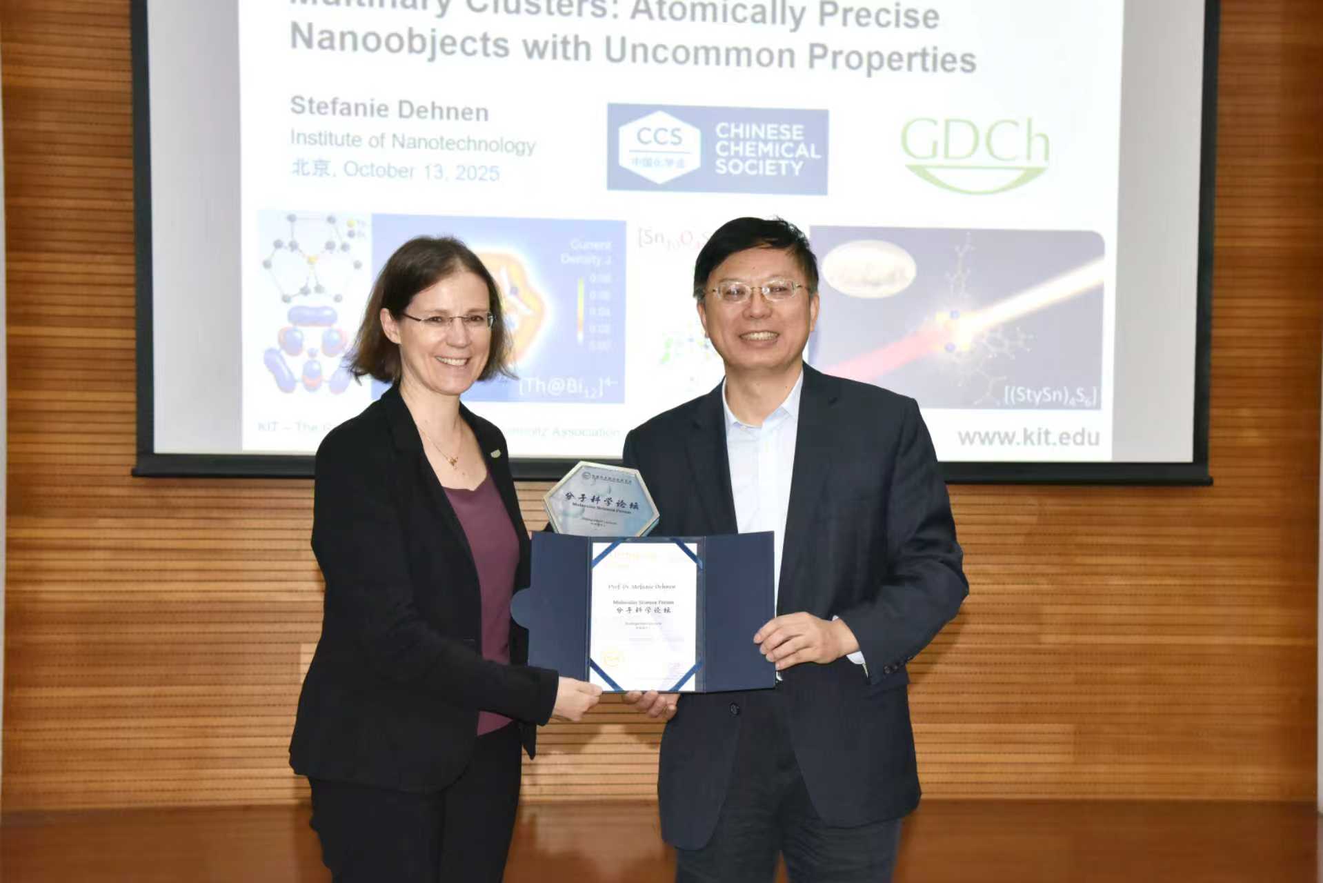 2025年10月13日,德国化学会主席、德国卡尔斯鲁厄理工学院纳米技术研究所Stefanie Dehnen教授访问化学所,并作题为“Multinary Clusters: Atomically Precise Nanoobjects with Uncommon Properties”的分子科学论坛报告。党委书记、副所长范青华研究员为Stefanie Dehnen教授颁发了“分子科学论坛”荣誉证书和奖牌,何圣贵研究员主持讲座。同期,中国化学会在化学所举办了Stefanie Dehnen教授荣誉会士授予仪式。中国化学会理事长万立骏院士为Stefanie Dehnen教授颁发荣誉会士证书。
