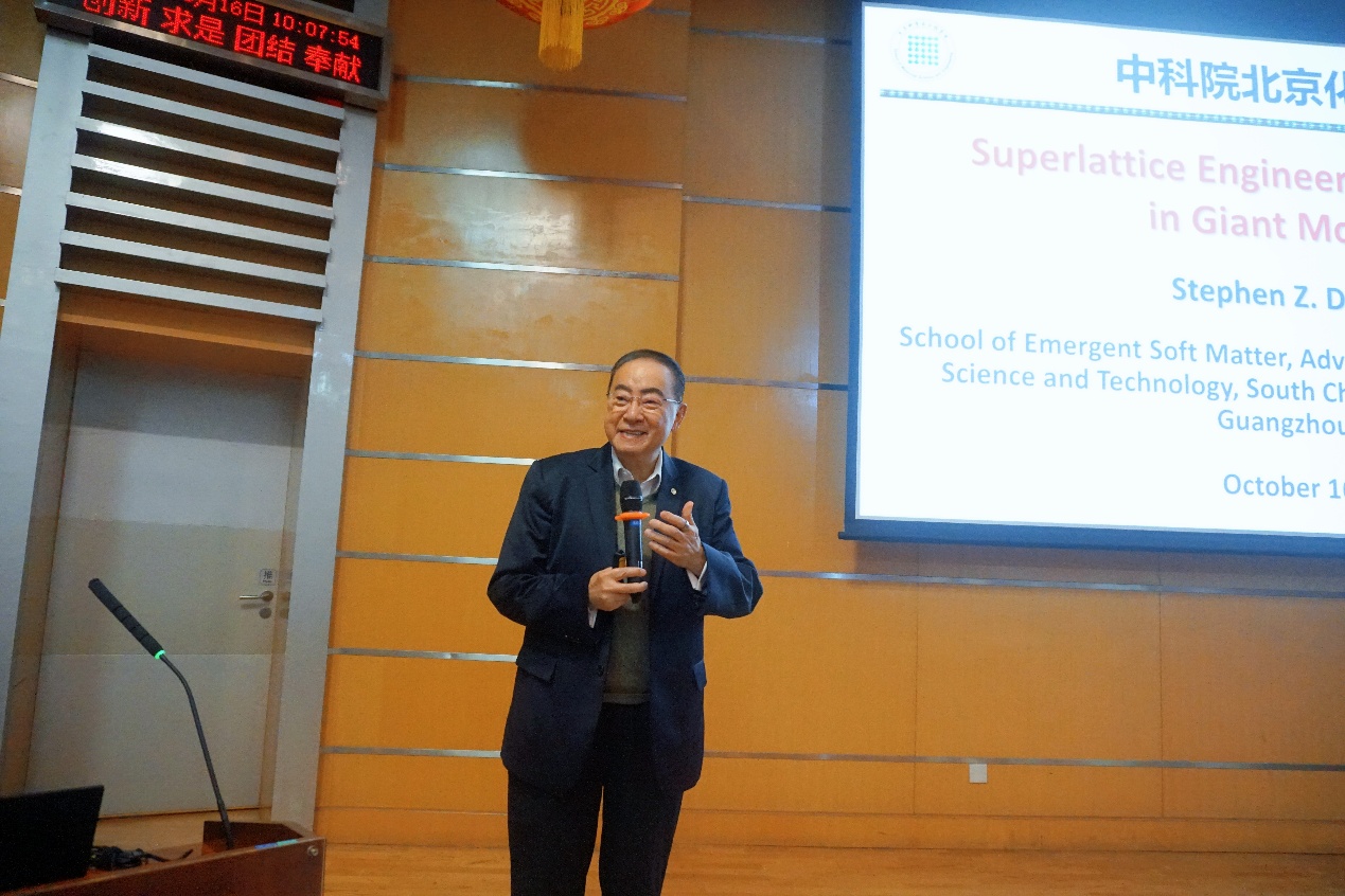 2025年10月16日,化学所名誉教授、华南理工大学、阿克伦大学程正迪教授访问化学所,并作题为“Superlattice Engineering of Soft Alloys in Giant Molecules”的分子科学论坛报告。所长王树研究员为程正迪教授颁发了“分子科学论坛”荣誉证书和奖牌,董侠研究员主持讲座。