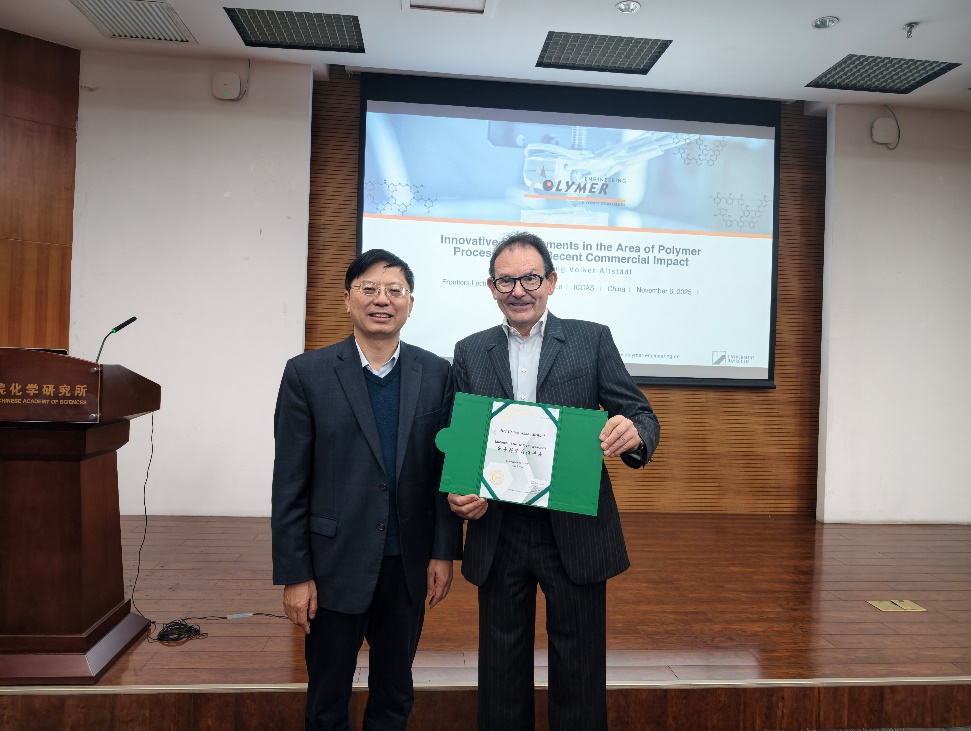2025年11月6日,德国拜罗伊特大学Ing. Volker Altstädt教授(Prof. Dr. Ing. Volker Altstädt)访问化学所,并作题为“Innovative Developments in the Area of Polymer Processing with Recent Commercial Impact”的分子科学前沿讲座。党委书记、副所长范青华研究员为Altstädt教授颁发了分子科学前沿讲座荣誉证书,董侠研究员主持讲座。