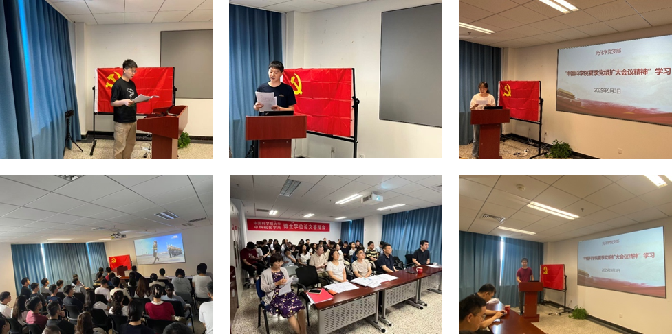 观看结束后,光化学党总支召开大会,党总支副书记、第一党支部书记张一帆带领大家交流了观看体会,进一步明确了本次阅兵的历史定位,并于交流后学习了中国科学院夏季党组扩大会议精神,进一步学习贯彻习近平总书记关于科技创新的重要论述以及对中国科学院的重要指示精神。张一帆强调,作为国家科学技术界最高学术机构的科研人员,应当将伟大抗战精神融入科研实践工作中,增强抢占科技制高点的使命感,扎实开展使命导向的自然科学基础研究。大会还进行了组织发展工作,经充分讨论和无记名投票,一致同意接收杨偲芃、任诗哲和潘庆君同志为中共预备党员。