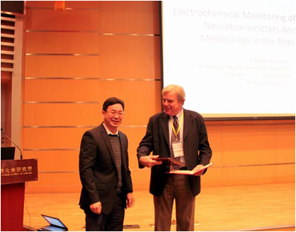 2015年10月25日,美国北卡罗来纳大学Mark Wightman教授应邀访问化学所,并作题为“Electrochemical Monitoring of Neurotransmitters and Metabolites in the Brain” 的分子科学论坛报告,报告由毛兰群研究员主持,张德清所长为Wightman教授颁发了“分子科学论坛” 荣誉证书和奖牌。