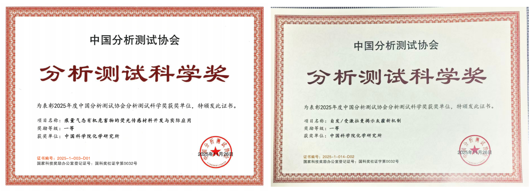 “痕量气态有机危害物的荧光传感材料开发与实际应用”(第一完成单位:中国科学院化学研究所;完成人:车延科,巩彦君,郭永先,籍宏伟,赵进才等)和“自发/受激拉曼揭示灰霾新机制”成果(第二完成单位:中国科学院化学研究所;完成人:张韫宏,葛茂发等)荣获一等奖。