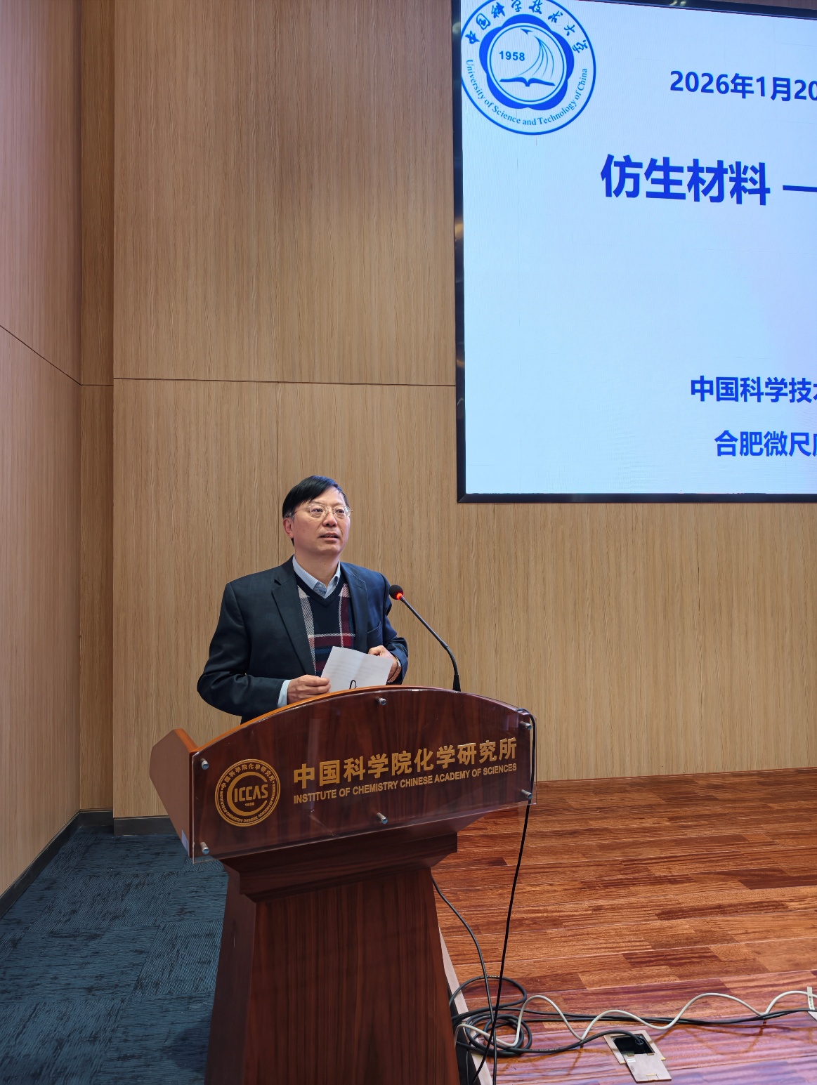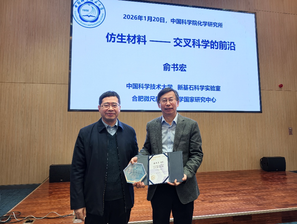 2026年1月20日,中国科学技术大学俞书宏院士访问化学所,并作题为“仿生材料——交叉科学的前沿”的分子科学论坛报告。王树所长为俞书宏院士颁发了“分子科学论坛”荣誉证书,党委书记、副所长范青华主持讲座。