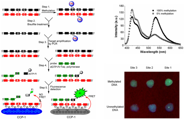 抑癌基因启动子区CpG岛的异常甲基化导致抑癌基因失活,是癌症发生的一个重要机制。在癌症早期了解相关抑癌基因启动子区CpG岛的甲基化状态,对于及时发现和治疗癌症非常重要。在前期工作中研究人员通过构建阳离子聚芴/DNA自组装体系,实现了DNA甲基化的灵敏检测(Adv. Mater. 2007, 19, 3490-3495)。在此工作基础上,最近他们又利用水溶性阳离子型共轭聚合物作为荧光探针,通过荧光共振能量转移为手段,发展了 DNA甲基化水平检测的新方法,该方法具有灵敏、简便等优点(J. Am. Chem. Soc. 2008,130, 11338-11343)。基因组DNA中单核苷酸多态性位点的分析和测定在遗传病诊断、药物设计以及基因联合研究等方面具有重要意义。他们构建了阳离子共轭聚合物/DNA自组装体系,通过控制能量转移过程,实现了对DNA单核苷酸多态性的灵敏检测(Chem. Commun. 2008, 1302-1304; Anal. Chem. 2008, 80, 2239-2243; Trends Biotechnol.2008, 26, 57-59)。