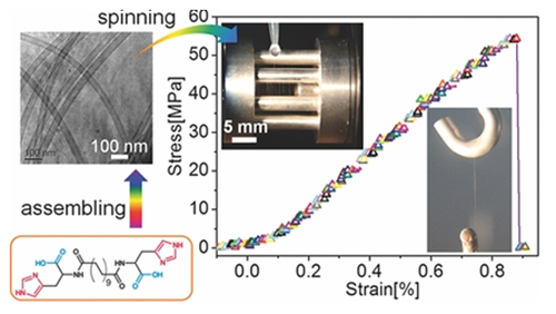 在这一研究中,研究人员首先通过超分子自组装,在水溶液中将结构很简单的有机小分子(L-组氨酸头基的Bola型两亲分子)组装成超分子纳米管。然后再使用纺纱的方法,将这些直径40纳米左右的超分子纳米管纺织成直径有几个微米而长度可接近一米的细丝。这一宏观尺度的组装体由成千上万根平行排列的超分子纳米管组成,不但具有高度有序的多层次结构,更能对精细的物质传输发挥作用。比如,溶于甲苯中卟啉分子可在其中定向传递超过一个厘米的距离。力学测试表明,这些基于非共价键、且具有规整多层次结构的宏观尺度的一维材料具有优良力学性能。其平均拉伸强度为50MPa左右,而杨氏模量则能达到6.8–9.9GPa的范围。这一强度丝毫不逊于多种共价高分子材料以及生物材料(Adv. Mater. 2013, 25, 5875–5879)。