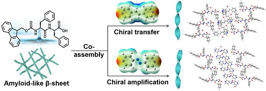 最近,该团队将芴基保护的L型苯丙氨酸二肽(L-FmocFF)分别与两种非手性吡啶衍生物进行共组装,制备得到的超分子凝胶组装体由具有淀粉样蛋白特性的β折叠结构转变为具有不同手性的超分子螺旋结构,并出现了鲜有的反超分子手性现象。通过分析凝胶形成的动力学过程以及分子间的相互作用,发现两种非手性分子不同的π-π堆积方式及在水中的聚集能力影响了手性碳在水中的微环境,诱导L-FmocFF发生选择性的手性转移或放大,从而实现了苯丙氨酸二肽类超分子凝胶的手性可控。该工作相关研究成果发表在近期的Angew. Chem. Int. Ed.(2020, DOI: 10.1002/anie.202012470),第一作者是博士后吴奥丽,通讯作者是李峻柏研究员。