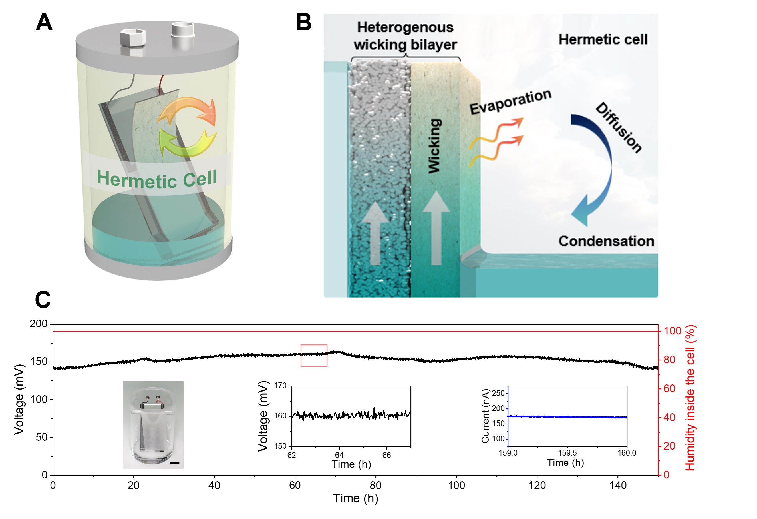 近期,该课题组利用图案化浸润材料作为水的蒸发介质,实现了密闭环境中水的自发定向流动与高效蒸发行为。他们制备了由低毛细效应的碳材料和高毛细效应的纤维材料组装而成的异质浸润结构。通过实验验证与计算模拟相结合的手段,证明了该结构可以在接近饱和湿度情况下,利用外界环境波动引起的温度梯度,产生持续的毛细芯吸和毛细蒸发行为,从而在密闭的容器中实现了水的内循环。基于此,研究团队构建了密封水伏电池。相比于现有开放式水蒸发发电器件受限于低湿度、持续水供给、易受外界环境干扰等缺点,密封水伏电池能够利用封闭式器件中水的内循环过程,将环境热能转化为电能。该电池具有较高的蒸发发电转化效率,有望用来驱动电子表、显示面板、计算器等常用设备,以及应用于黑暗、沙漠、雨林等传统光伏水伏器件难以应用的场景,为绿色能源的高效利用提供新途径。