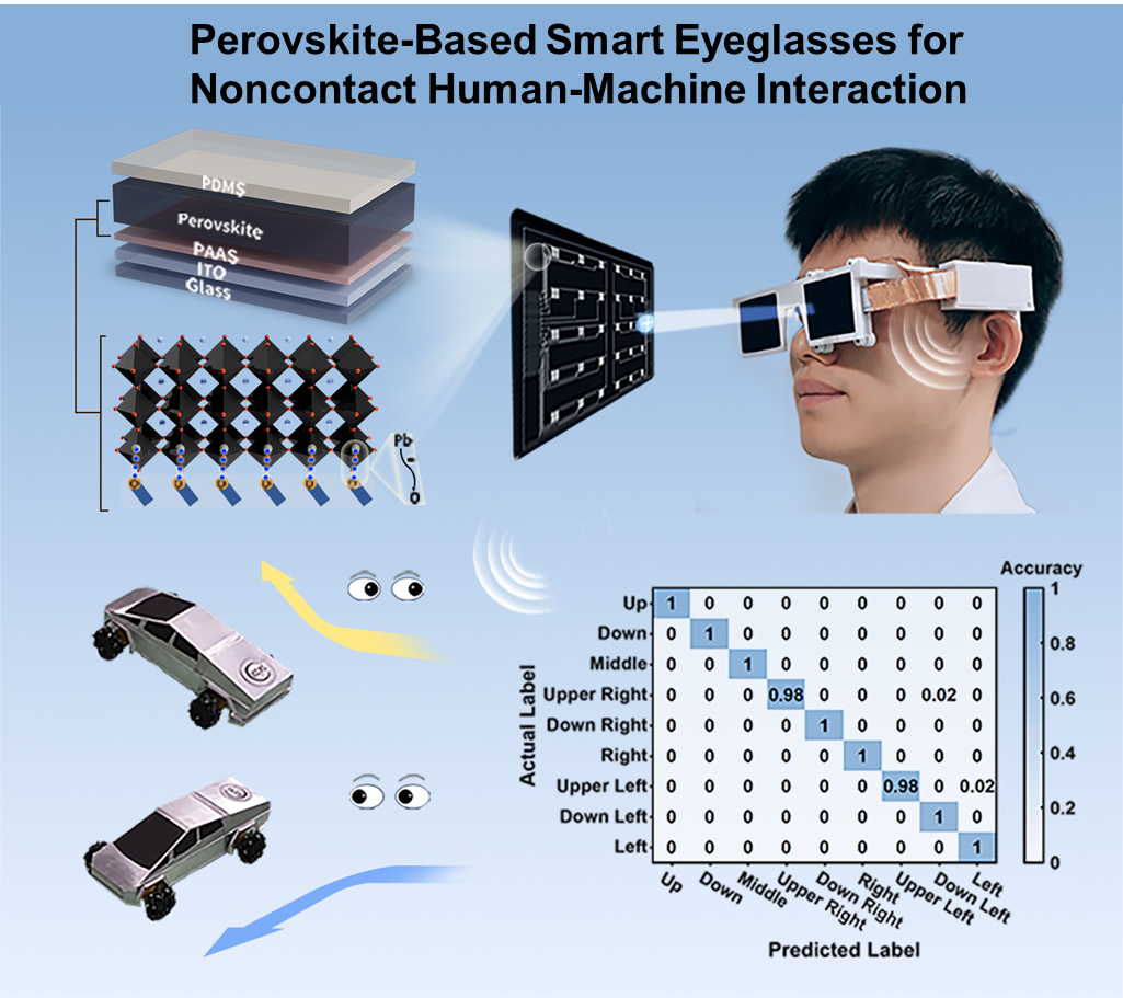 最近,该团队基于仿生矿化策略,在玻璃基底上成功制备了大晶粒钙钛矿薄膜,并构建了集成钙钛矿光电探测器的智能眼镜系统,实现了基于眼球操控的人机交互展示。该策略通过引入聚丙烯酸钠界面层,有效钝化了薄膜缺陷,促进高质量钙钛矿薄膜生长。基于此制备的钙钛矿光电传感器在500 Lux光照条件下,实现了接近300倍的开关比,并展现出高达22.09 A/W的光响应性能。他们进一步将高性能钙钛矿光电传感器阵列集成为可穿戴智能眼镜,通过卷积神经网络算法的优化,智能眼镜可以实现眼球运动的高精度识别。在角度分辨率5°测试条件下,识别准确率高达99.86%;对于9种不同指令,识别准确率达到99.08%。此外,操控者通过控制眼球轨迹操控模型汽车在复杂场景中的准确行进,展现了突出的人机交互能力。