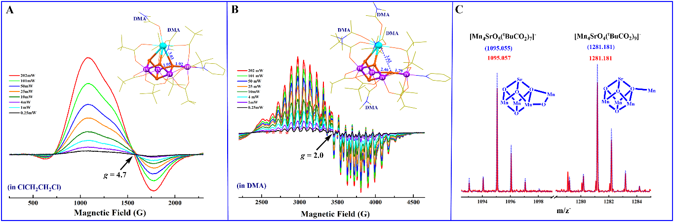 图2.仿生Mn4SrO4/5-簇合物的EPR(A、B)和质谱(C)探测